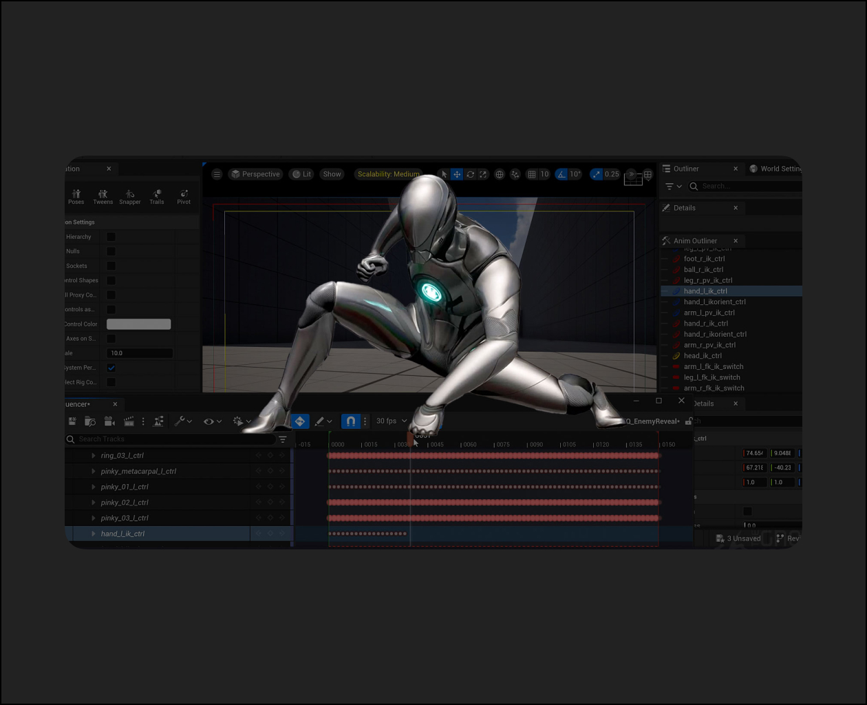 Instructed by Bill Buckley, the workshop begins with a look at how to implement trigger planes, which act as interactive zones within the game world, activating animations or events when the player enters or interacts with them. From there, he explores level sequencers to create cinematic sequences that can be triggered in response to player actions, enhancing the storytelling experience further. The tutorial also covers animation montages, allowing artists to synchronize complex character animations with gameplay actions. Bill also dives into Unreal Engine’s new Control Rig, a powerful tool that allows students to author animations directly within Unreal Engine; this technique dramatically speeds up iteration time and enhances the workflow for developing character content, allowing artists to adjust animations and quickly see results in real-time.