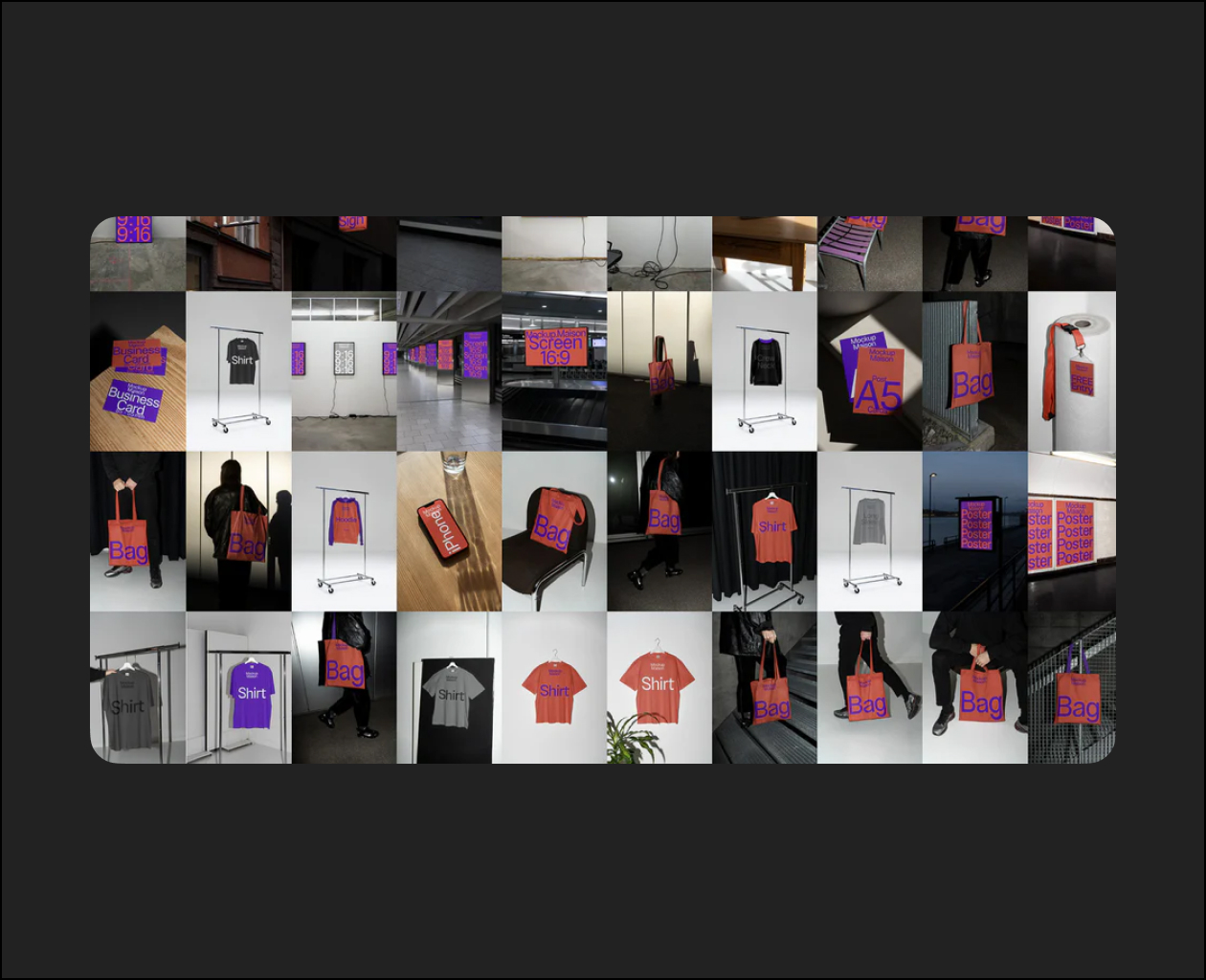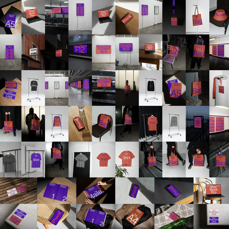 This collection includes 70 Mockups. You’ll get a variety of Apparel, Business Cards, Badges, Bags, Books, Cards, Packaging, Laptops, Magazines, Phones, Screens, Signs, Urban Posters.